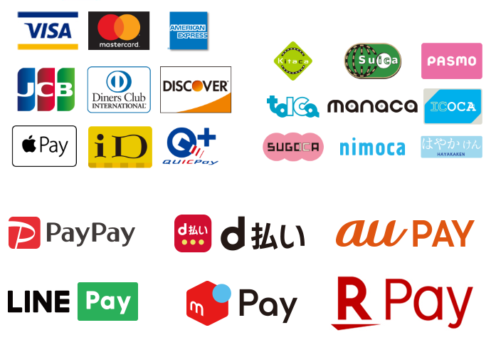 - 各種クレジットカード、電子マネー、Apple Pay、LINE Payなどに対応。決済手数料は頂きません。カード決済手数料